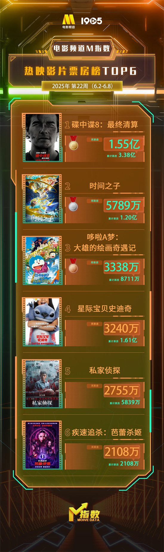 1905电影网讯 “电影频道M指数”2025年第22周结果发布。6月2日-6月8日,“电影频道M指数”热映影片票房榜前6位依次为: